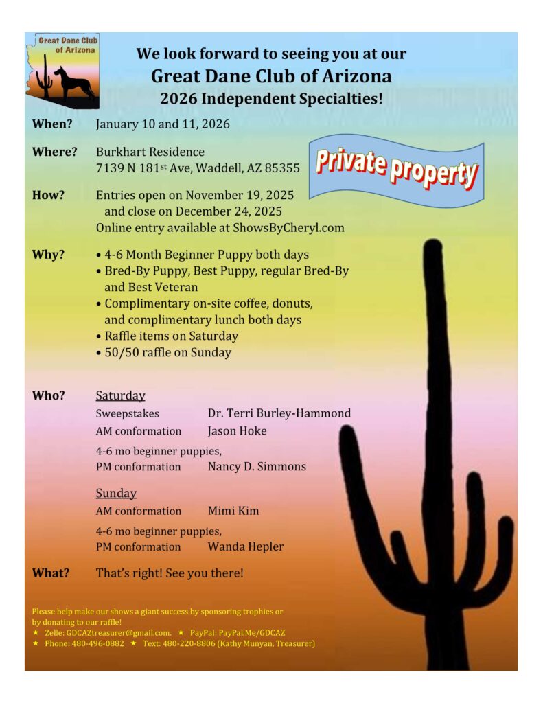 This is a comprehensive list of Great Dane Club of America affiliate clubs specialties. If your club is having a specialty and want it listed on our pages please contact Melissa Ekis and provide her with dates and events.